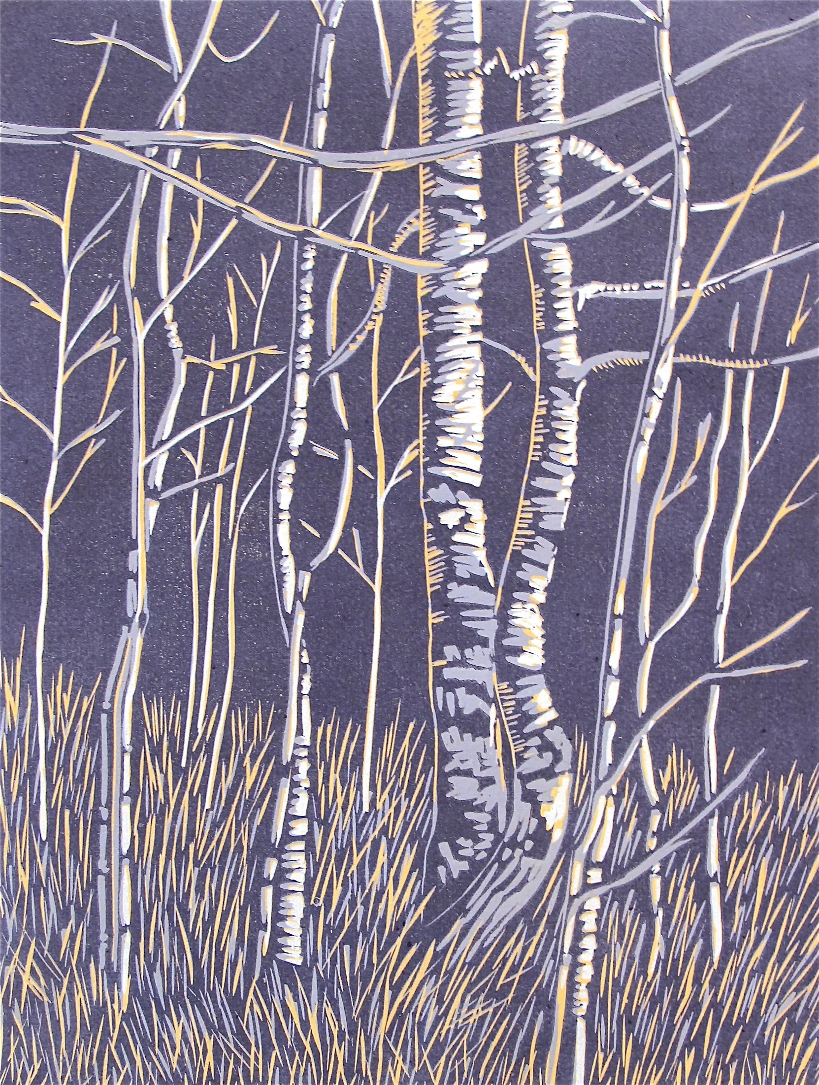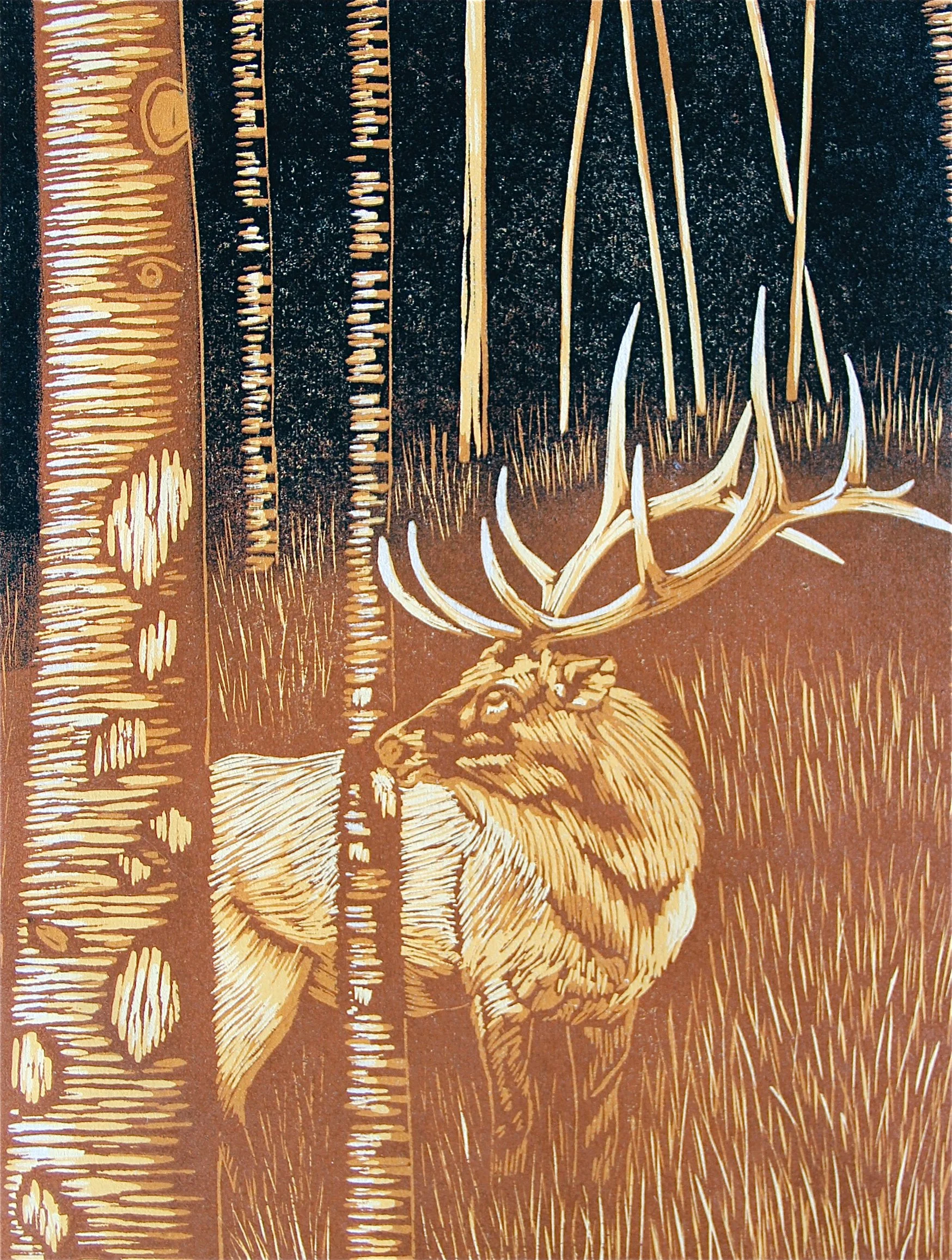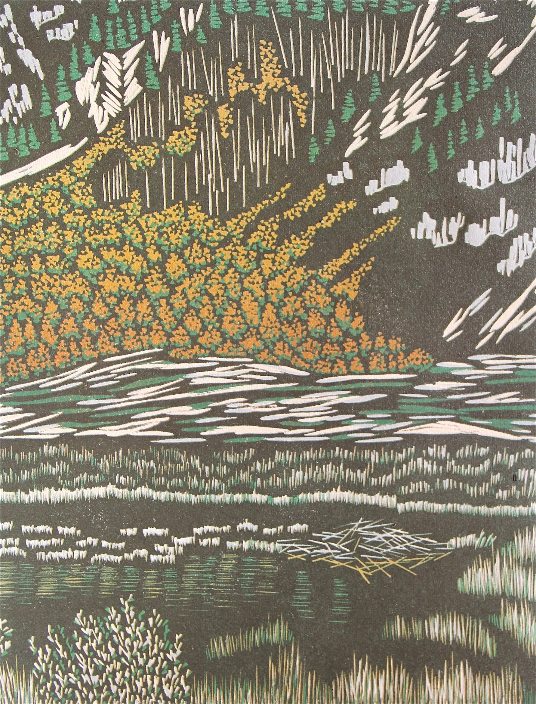 I carve a collection of textural, dimensional lines which is transformed by reduction printing into shapes, specks of hues, shadows and layers. This interplay of lines and layers of color is a blending ultimately of part representational, part abstraction.