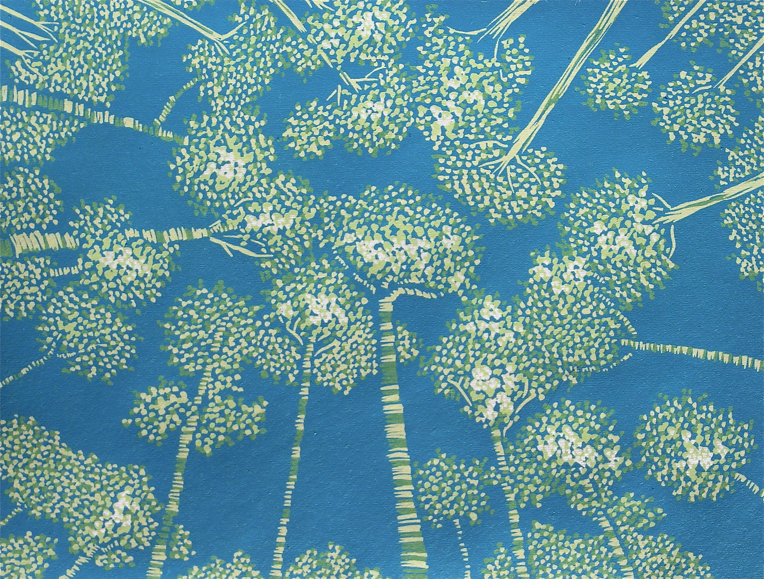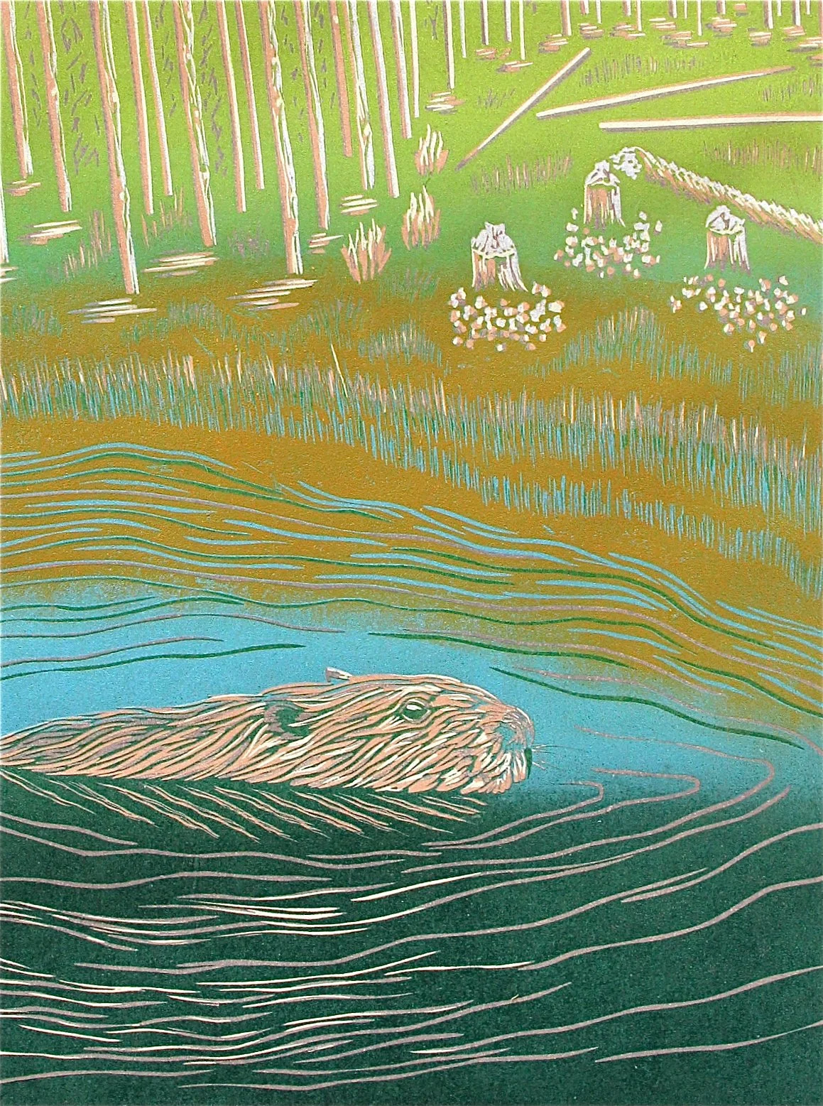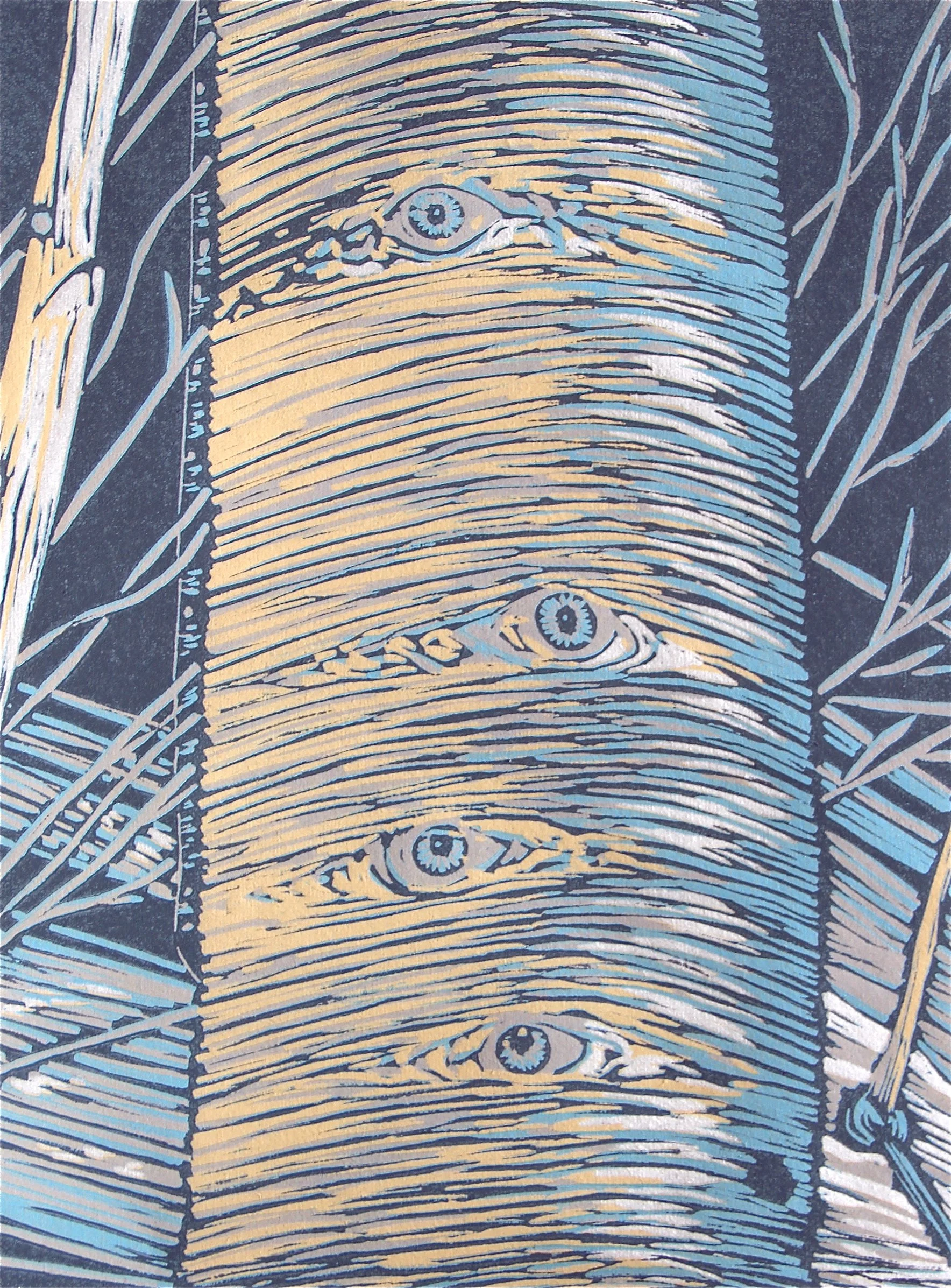 I carve a collection of textural, dimensional lines which is transformed by reduction printing into shapes, specks of hues, shadows and layers. This interplay of lines and layers of color is a blending ultimately of part representational, part abstraction.