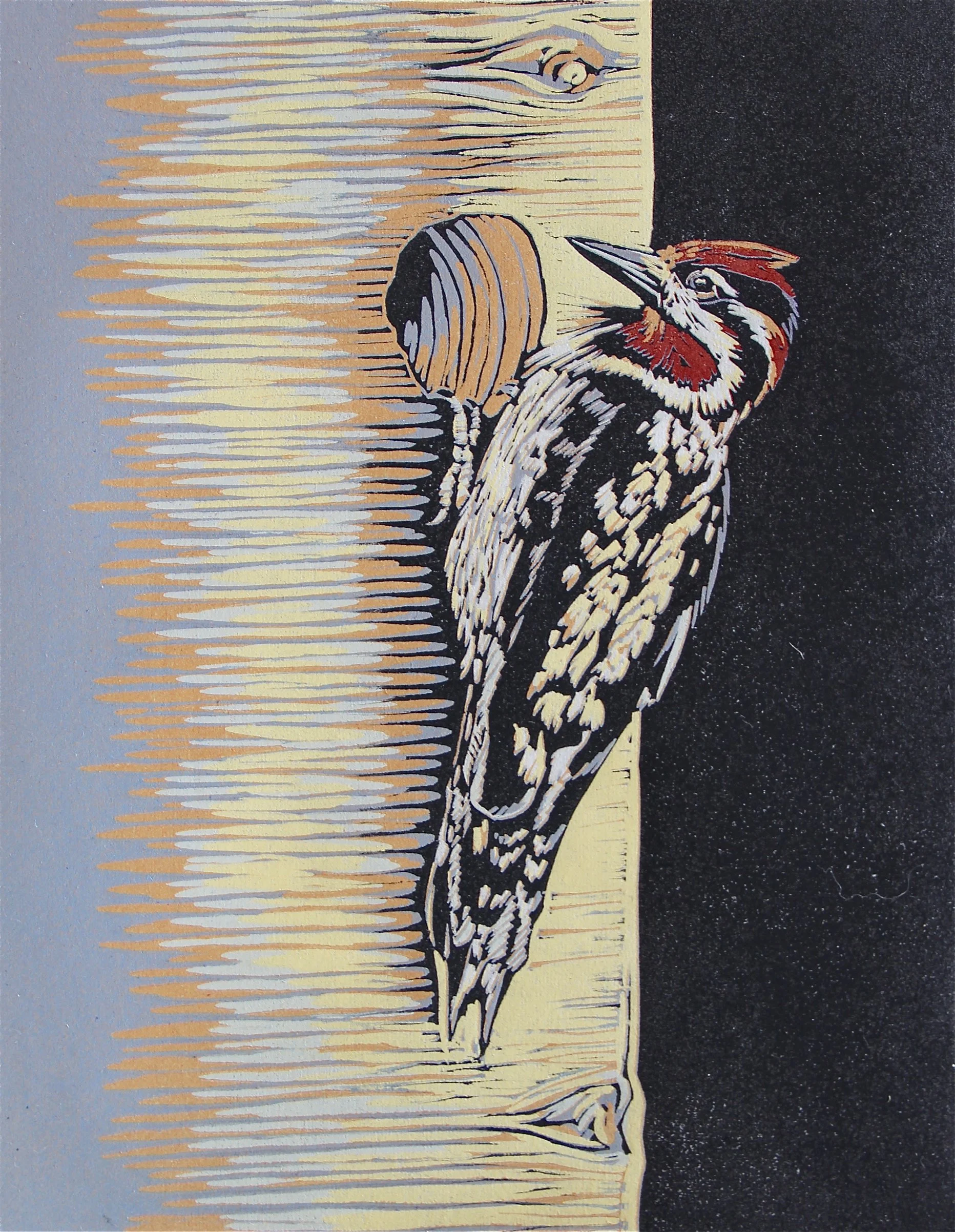 This work is all hand carved and hand printed by me. The layers of color are achieved by slowly reducing the block through multiple carvings. Each color is a separate layer of carving.